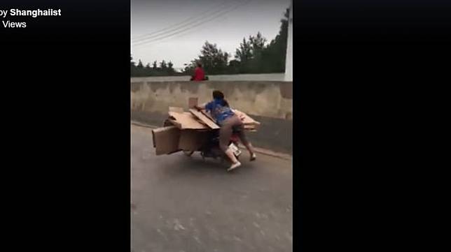 Gilanya, ia mengendarai motor dengan tumpukkan kardus penuh tanpa mengenakan helm dan jaket.
